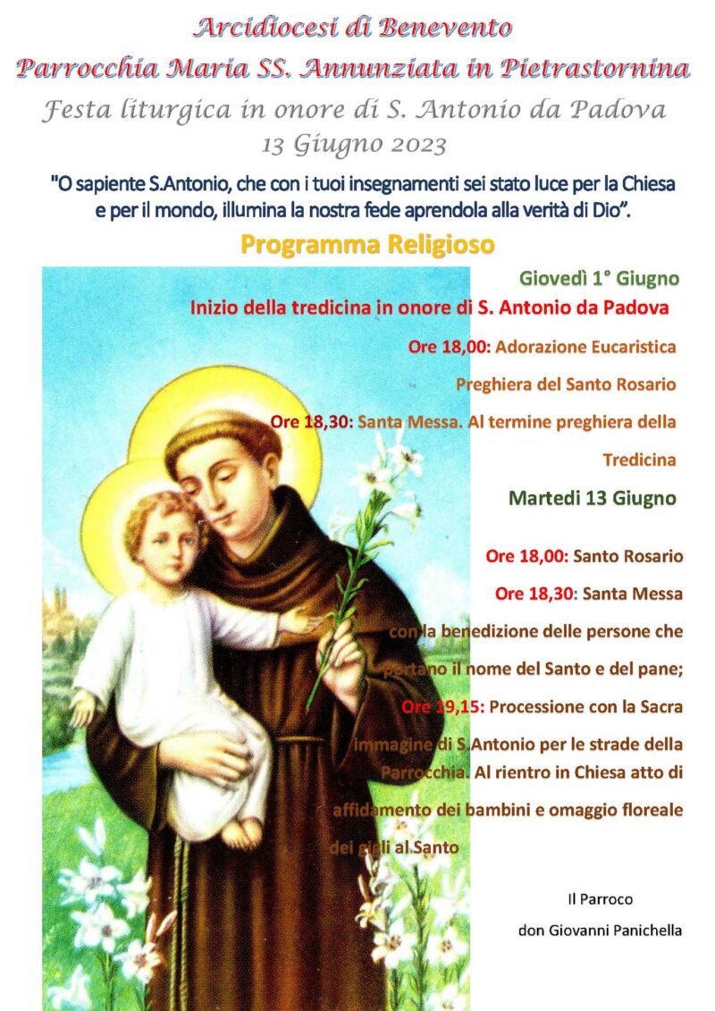 Pietrastornina: festa liturgica di S. Antonio da Padova A Pietrastornina festeggiamenti in onore di S. Antonio da Padova. Per il programma vedi il manifesto…