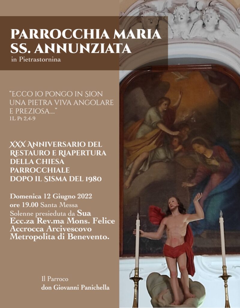 La parrocchia Maria SS. Annunziata in Pietrastornina domenica 12 giugno alle ore 19 con la solenne santa Messa, presieduta dall’arcivescovo mons. Felice Accrocca, ricorda il XXX anniversario del restauro e riapertura della chiesa parrocchiale.
