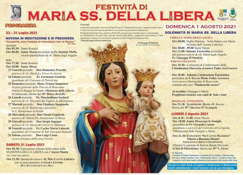 Pietrelcina festa della Madonna della Libera La comunità di Pietrelcina si prepara alla festività di Maria SS. della Libera. Per il programma vedi il manifesto…