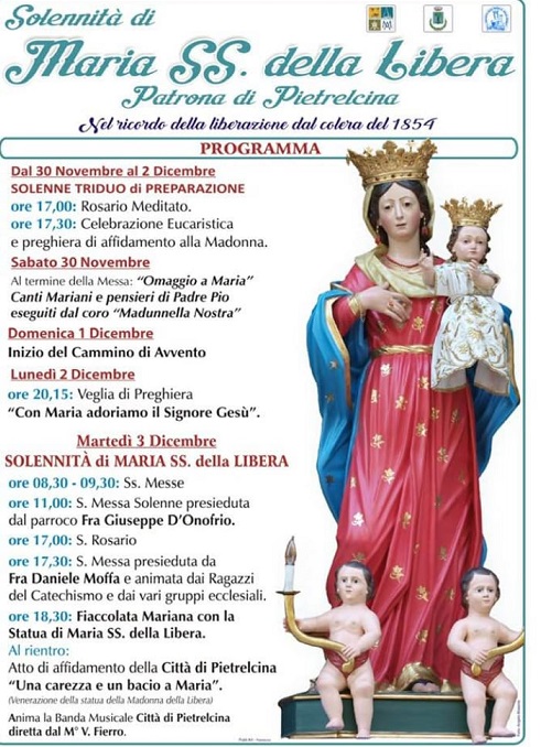 La Madonna amata da Padre Pio e venerata da tutti i pietrelcinesi, patrona del paese, sarà solennemente festeggiata il prossimo 3 dicembre in occasione dell’anniversario del miracolo attribuitogli da tutti i fedeli, quando nel 1854 liberò il paese dall’epidemia di colera che imperversava facendo numerose vittime. La statua di Maria SS. della Libera fu portata in processione per le vie della cittadina e a lei furono rivolte incessanti preghiere affinché non ci fossero più morti a causa di questa terribile pestilenza. E da quel 3 dicembre pian pian la popolazione riprese nuova vita, non più afflitta e martoriata, ma felicemente gioiosa e consapevole di avere una Mamma celeste a protezione delle propria comunità. Padre Pio, fin dalla nascita, è vissuto con questa speciale devozione alla Madonna della Libera, tramandata dai suoi genitori e familiari, e ha potuto sperimentare personalmente le amorevoli cure della “sua Madonnella”, che non gli ha mai fatto mancare il sostegno e la forza per perseverare nella vocazione intrapresa e per adempiere la missione che il Signore gli aveva preparato. Vedi il manifesto per il programma…