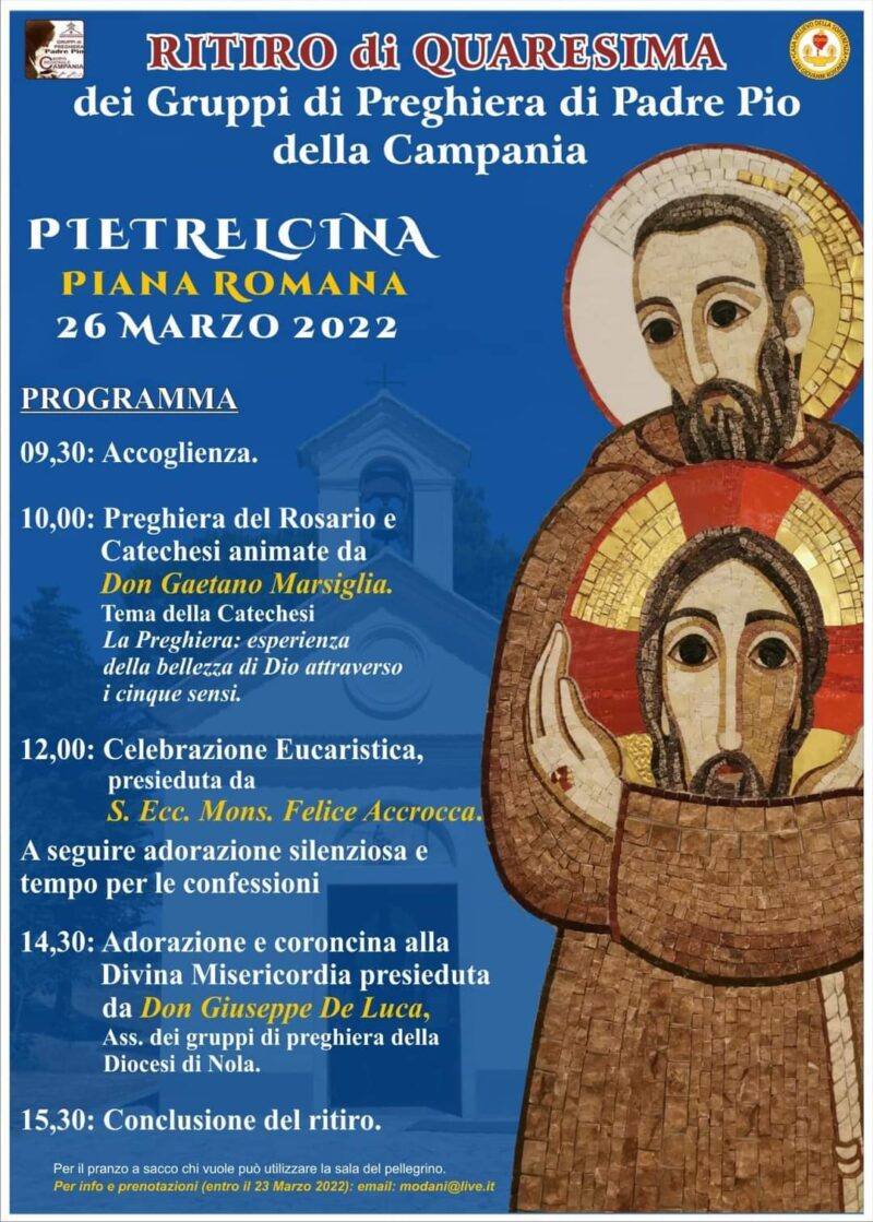 Pietrelcina: ritiro di Quaresima A Pietrelcina ritiro di Quaresima dei gruppi di preghiera di padre Pio della Campania il 26 marzo. Per Il programma vedi il manifesto…