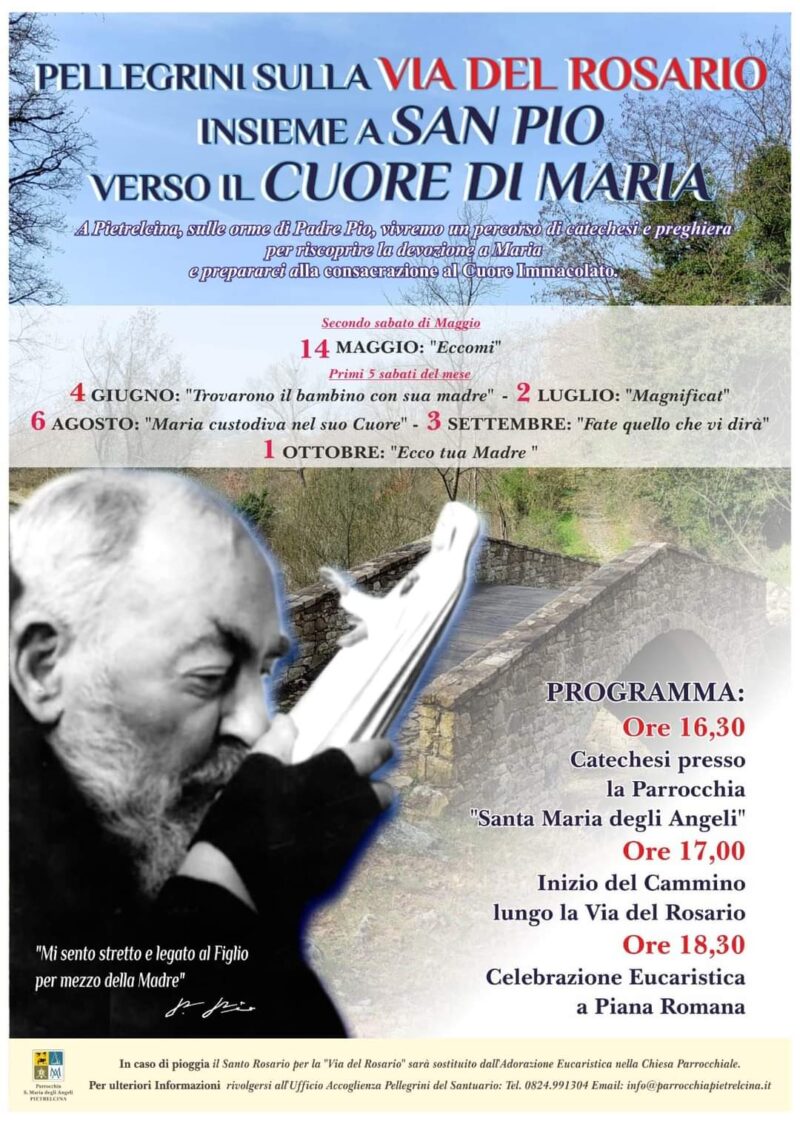 Pietrelcina: sulla via del Rosario A Pietrelcina, sulle orme di Padre Pio, vivremo un percorso di catechesi e preghiera per riscoprire la devozione a Maria e prepararci alla consacrazione al Cuore Immacolato. Per il programma vedi il manifesto…