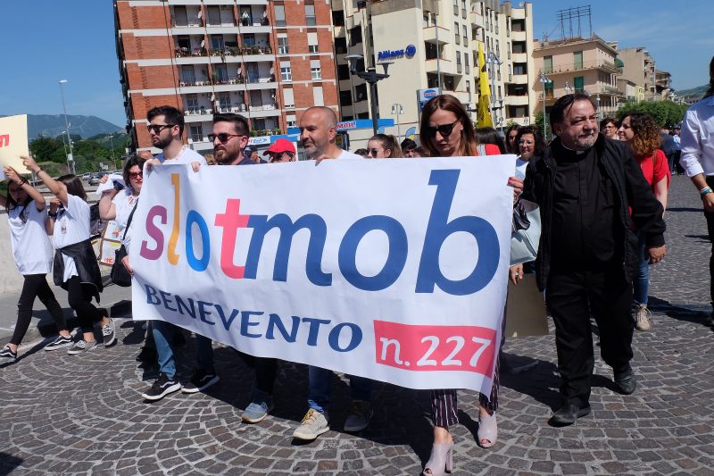 La mattina del 20 maggio, per il #PortidiTerra, è stata una festa di partecipazione civile con lo Slotmob nazionale #227: una marcia, lungo le strade della città, partita da piazza Bissolati, luogo simbolo, poiché di fronte a un centro scommesse vi è un bar che ha deciso di non vendere l’azzardo. I giovani delle scuole in rete con Caritas Benevento, dell’azione Cattolica, gli scout, Acli Benevento, Libera, hanno marciato fino a piazza Roma, dove vi è un altro grande centro scommesse e a pochi passi il bar Strega che ha deciso di non mettere, nei suoi locali, le slotmachine.