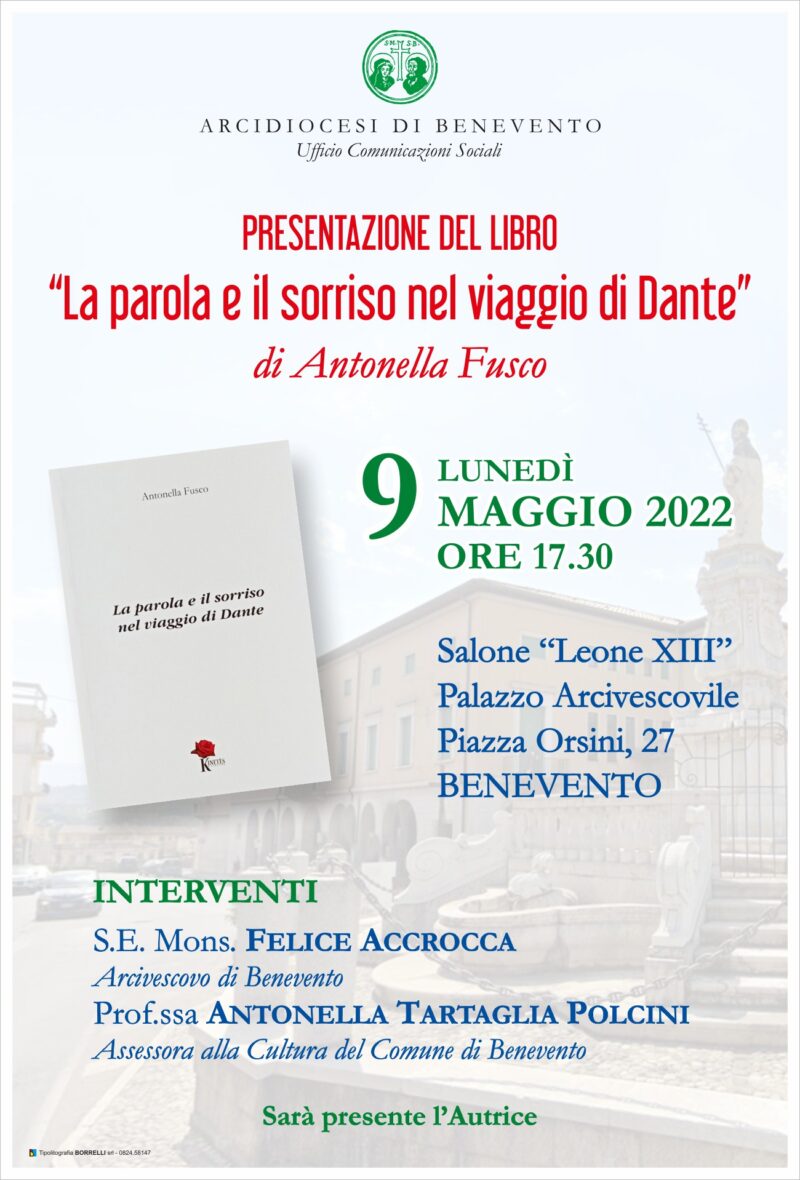 Lunedì 9 maggio alle ore 17,30, nel salone Leone XIII del palazzo arcivescovile di Benevento, sarà presentato il libro “La parola e il sorriso nel viaggio di Dante” di Antonella Fusco. Interverranno: mons. Felice Accrocca, arcivescovo di Benevento; prof.ssa Antonella Tartaglia Polcini, assessora alla Cultura del Comune di Benevento. La partecipazione sarà regolata secondo la vigente normativa anti-Covid.