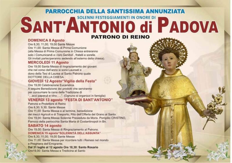 La parrocchia della Santissima Annunziata di Reino ha organizzato i festeggiamenti in onore di S. Antonio di Padova. Per il programma vedi il manifesto…