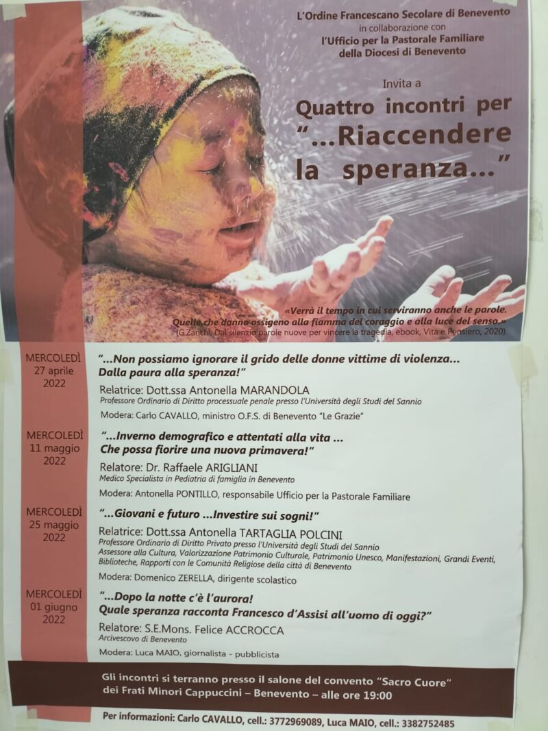 L’Ordine Francescano Secolare di Benevento in collaborazione con l’Ufficio per la Pastorale Familiare della Diocesi di Benevento invita a partecipare a quattro incontri (mercoledì 27 aprile 2022, mercoledì 11 maggio 2022, mercoledì 25 maggio e mercoledì 1° giugno 2022) per “Riaccendere la speranza…”. Gli incontri si terranno presso il salone del convento “Sacro Cuore” dei Frati Minori Cappuccini di Benevento dalle ore 19.