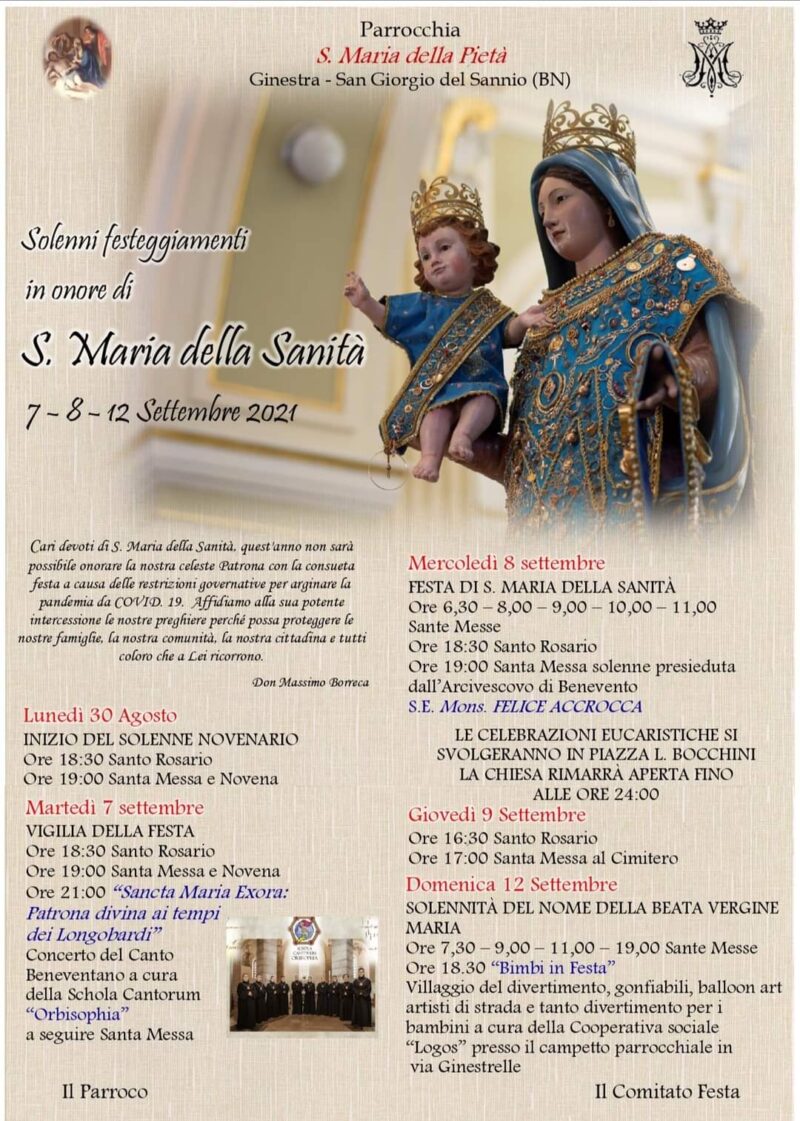 Don Massimo Borreca, parroco di S. Maria della Pietà di Ginestra in S. Giorgio del Sannio, ha organizzato i festeggiamenti religiosi per Santa Maria della Sanità. Per il programma vedi il manifesto…