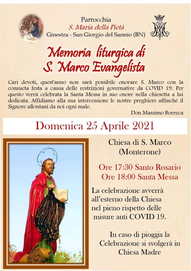 Domenica 25 aprile alle ore 18, all’esterno della chiesa di Monterone, santa Messa nella memoria liturgica di San Marco Evangelista. Così il parroco don Massimo Borreca: “Cari devoti, quest’anno non sarà possibile onorare S. Marco con la consueta festa a causa delle restrizioni governative da Covid 19. Per questo verrà celebrata la santa messa in suo onore nella chiesa a lui dedicata. Affidiamo alla sua intercessione le nostre preghiere affinché il Signore allontani da noi ogni male”.