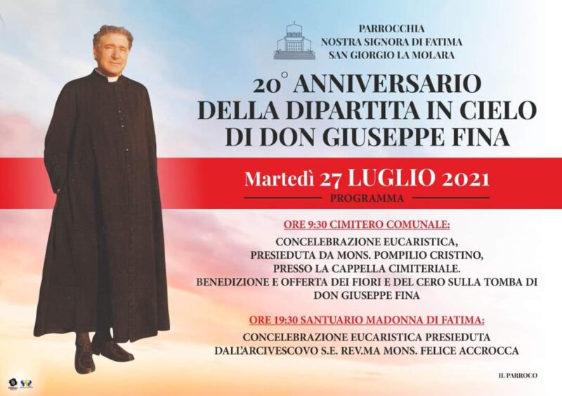 Lo slargo in questione sarà l’area compresa tra piazza Madonna di Fatima e l’inizio di vico Fiera. Don Giuseppe Fina nacque nel 1920 a Montemiletto e spese la sua vita al servizio della comunità sangiorgese per ben 57 anni. Morto nel 2001, è stato uno dei massimi artefici delle attività sociali oltre a quelle religiose, che tanto hanno contribuito al bene del paese fortorino.