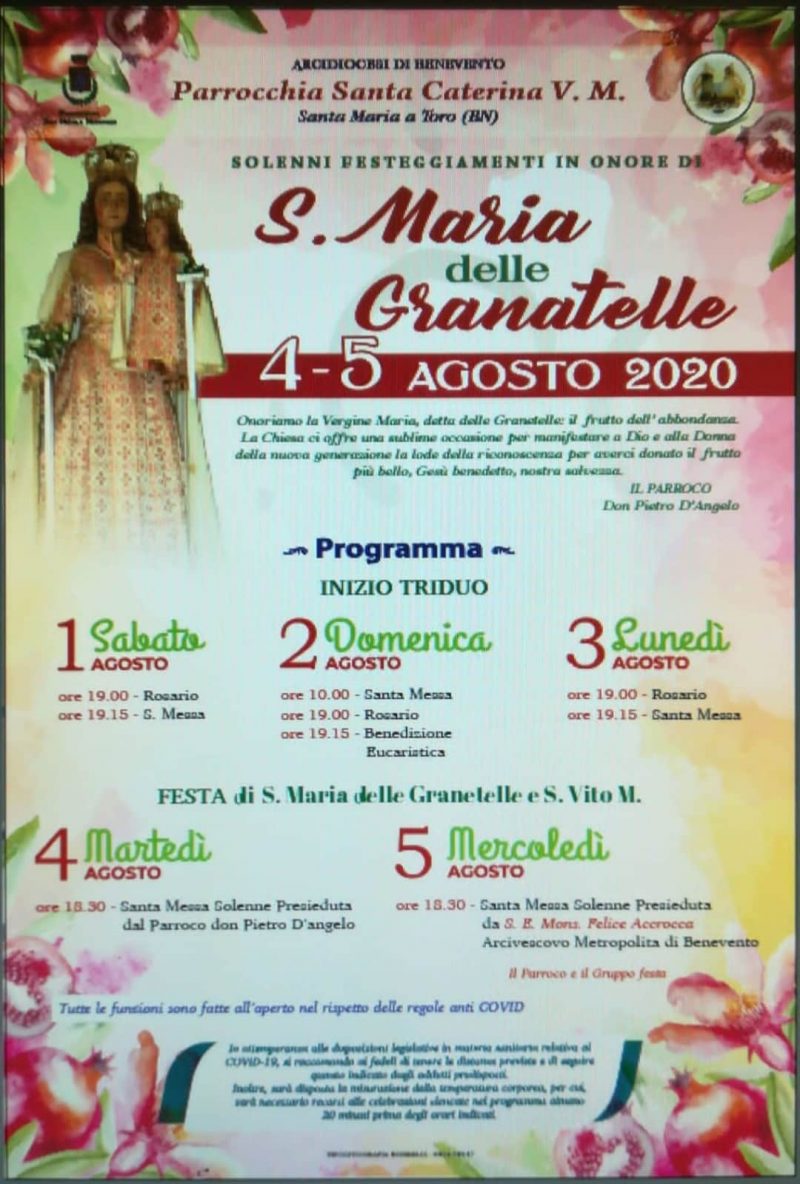 Anche quest’anno siamo pronti ad onorare La Madonna delle Granatelle e S. Vito M. Sarà una festa patronale diversa. Una festa nel segno della sobrietà, del rigore, delle diverse cose che purtroppo non si potranno fare per legge, tuttavia, nessuno potrà toglierci la possibilità di abbracciare spiritualmente, con l’amore di sempre, i nostri celesti Patroni. Non ci sarà la processione, non ci sarà la Santa Messa nella chiesetta rupestre e la veglia notturna, non ci sarà la banda, non ci sarà lo spettacolo pirotecnico, il gruppo musicale, la serata conviviale, etc. Ma ci saranno la Madonna e San Vito e ci saremo noi, presenti come ogni anno, al triduo di preparazione alla festa e alle celebrazioni eucaristiche all’aperto, nelle quali esprimeremo la nostra devozione e la gratitudine per la loro sollecitudine verso di noi, che siamo il loro popolo prediletto. Santa Maria delle Granatelle e San Vito M., pregate per noi e per il mondo intero. Amen.