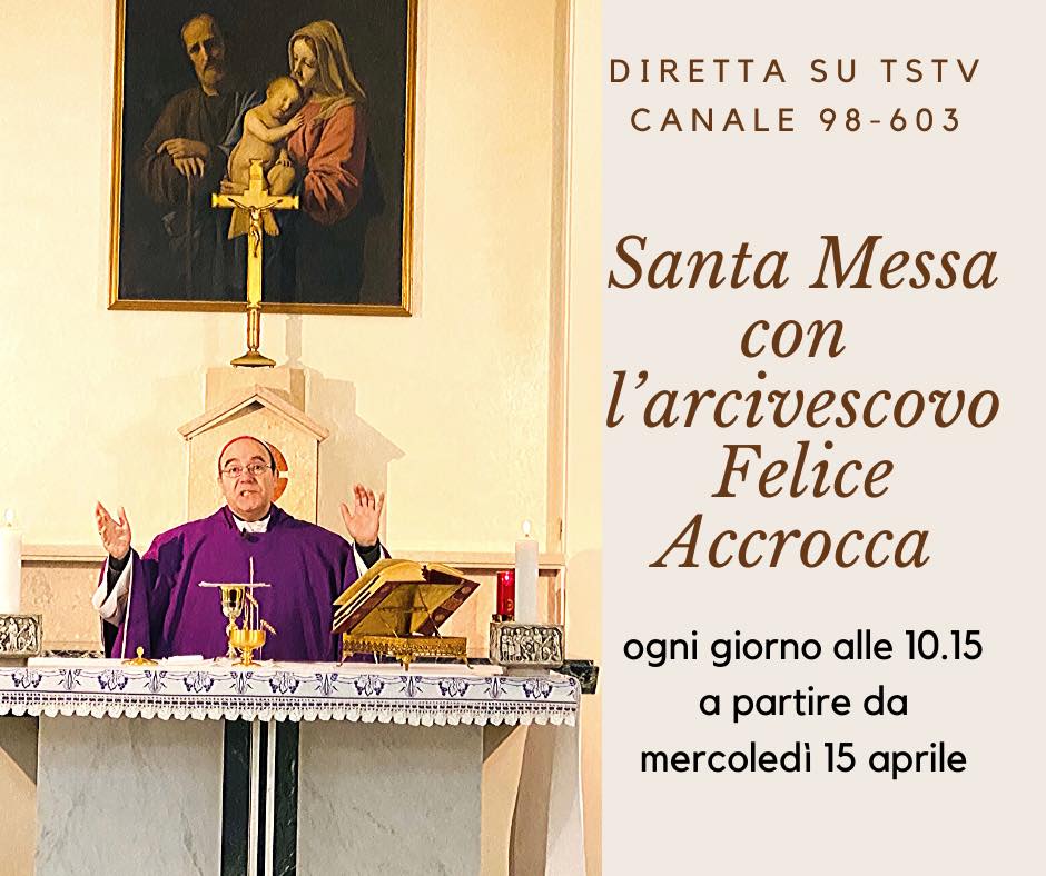 Mercoledì 15 aprile 2020 riprende la trasmissione in diretta tv della s. messa presieduta da mons. Felice Accrocca. Un appuntamento diventato ormai caro ai fedeli dell’arcidiocesi, che impediti a partecipare di persona alla celebrazione eucaristica dalle recenti disposizioni governative, trovano grande giovamento nel seguire Tstv ai canali 98 o 603 del digitale terrestre oppure collegandosi alla pagina Facebook Tstv. Tutti i giorni, a partire dalle ore 10,15.