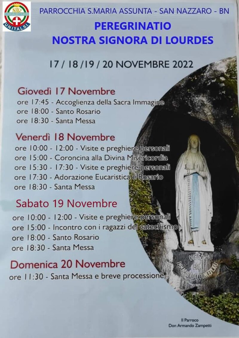 San Nazzaro: ” Peregrinatio Nostra Signora di Lourdes” Nella parrocchia S. Maria Assunta di San Nazzaro dal 17 al 20 novembre 2022 “Peregrinatio di Nostra Signora di Lourdes”. Per il programma vedi il manifesto…