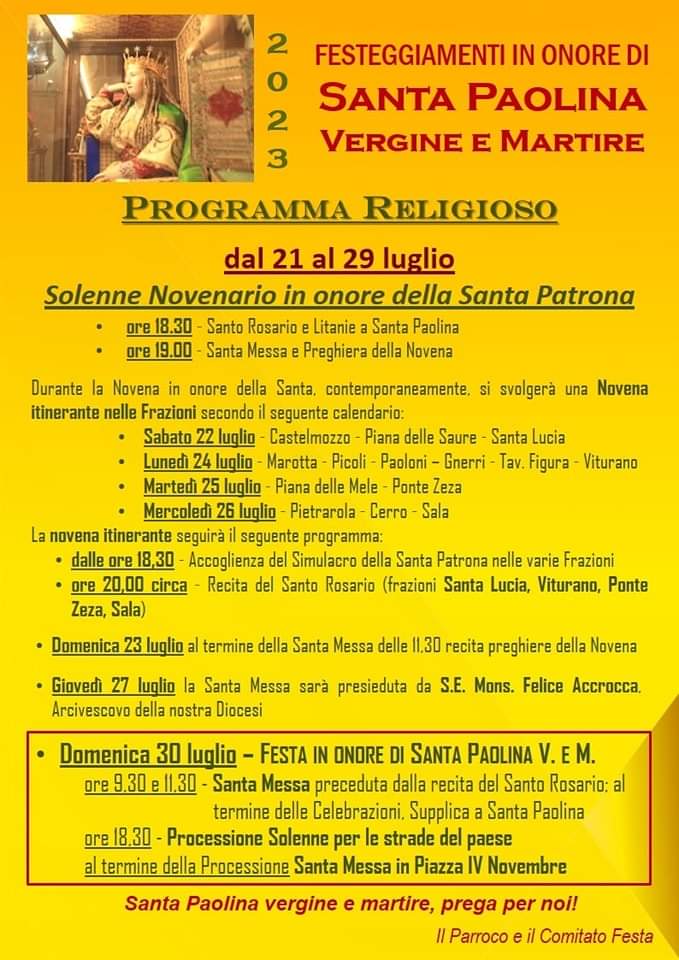 La comunità di Santa Paolina (Av) dal 21 al 29 luglio 2023 festeggia la patrona: Santa Paolina Vergine e Martire. Per il programma vedi il manifesto…