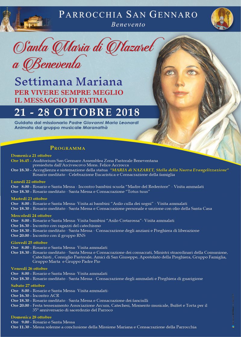 Dal 21 al 28 ottobre 2018 si vivrà a Benevento nella parrocchia di San Gennaro la settimana mariana. L’iniziativa voluta per vivere sempre meglio il messaggio di Fatima. La settimana mariana sarà guidata dal missionario padre Giovanni Maria Leonardi e animata dal gruppo musicale Maranathà. Per il programma vedi il manifesto allegato…