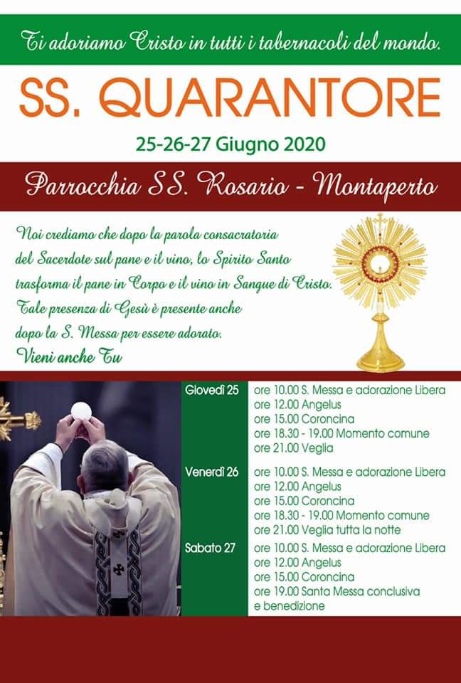 Tre giorni di preghiera nella parrocchia SS. Rosario di Montaperto dal 25 al 27 giugno. SS.Quarantore a partire da giovedì 25 giugno dalle ore 10 e terminare sabato 27 giugno alle ore 19 con la santa Messa e benedizione. Per l’intero programma vedi manifesto…