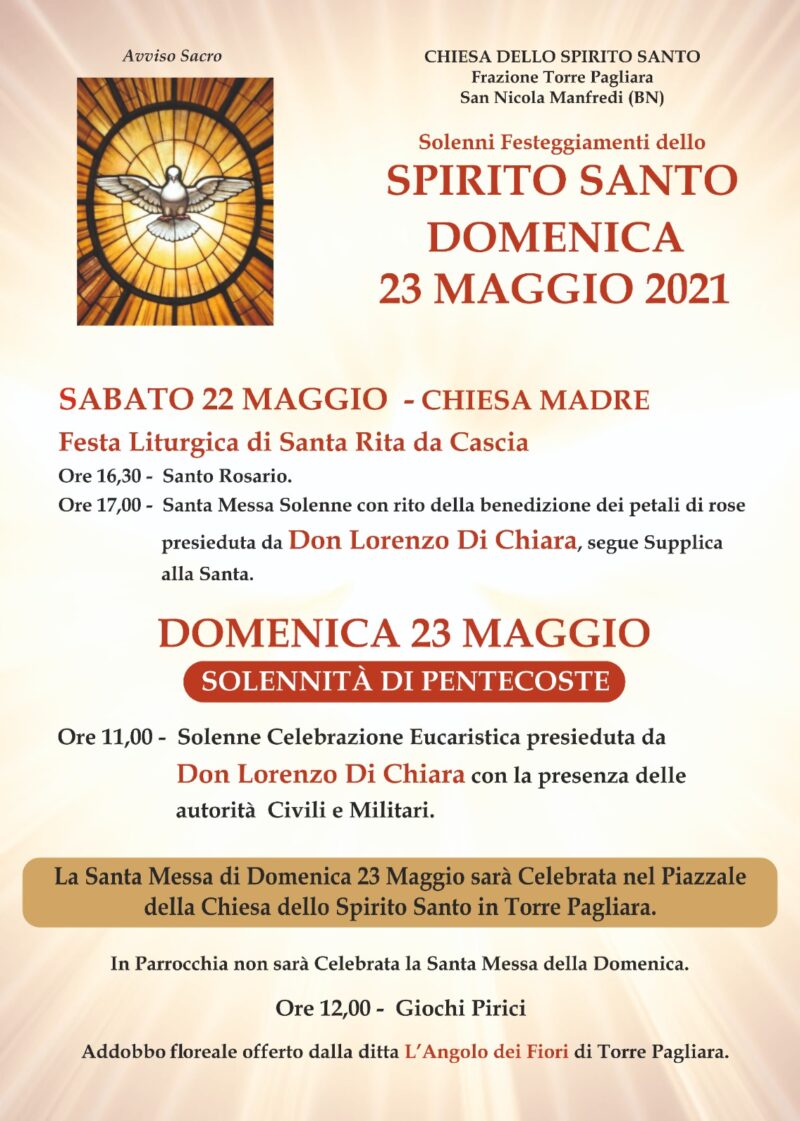Torre Pagliara: festeggiamenti per lo Spirito Santo A Torre Pagliara domenica 23 maggio solenni festeggiamenti dello Spirito Santo. Per il programma vedi il manifesto…