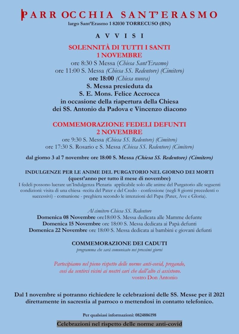 Il 1° novembre a Torrecuso l’arcivescovo mons. Felice Accrocca presiederà, alle ore 18, la santa messa in occasione della riapertura della chiesa dei SS. Antonio da Padova e Vincenzo diacono. Per il programma vedi il manifesto…