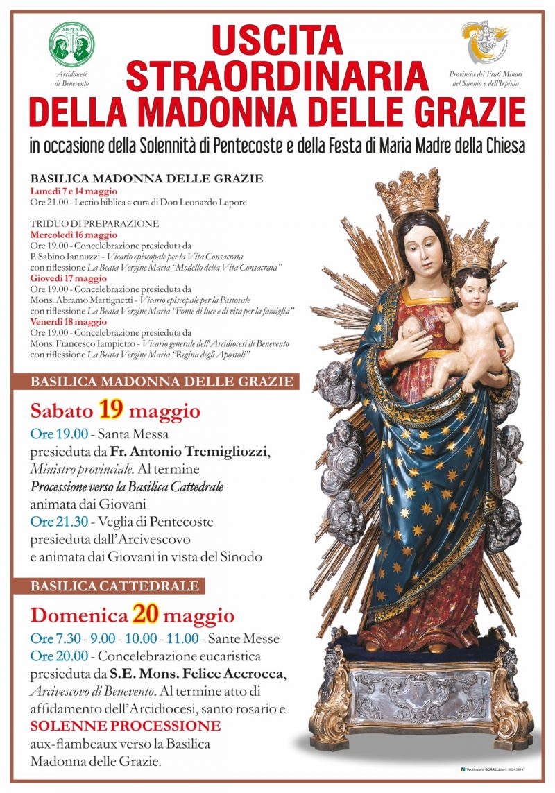 L’uscita straordinaria della statua della Madonna delle Grazie è stata pensata per “solennizzare” la decisione di Papa Francesco di rendere obbligatoria la memoria di Maria Madre della Chiesa, da celebrarsi il lunedì dopo Pentecoste. Nella basilica della Madonna delle Grazie lunedì 14 maggio, alle ore 21, la lectio biblica di don Leonardo Lepore. Mentre il triduo di preparazione parte mercoledì 16 maggio, alle ore 19, sempre nel santuario della Madonna delle Grazie, concelebrazione eucaristica presieduta da padre Sabino Iannuzzi, vicario episcopale per la Vita Consacrata con la riflessione: «La Beata Vergine Maria “Modello della Vita Consacrata”»; giovedì 17 maggio, ore 19, concelebrazione presieduta da mons. Abramo Martignetti, vicario episcopale per la Pastorale, con la riflessione :«La Beata Vergine Maria “Fonte di luce e di vita per la famiglia”» e venerdì 18 maggio, ore 19, concelebrazione presieduta da mons. Francesco Iampietro, vicario generale dell’Arcidiocesi di Benevento, con la riflessione: « La Beata Vergine Maria “Regina degli Apostoli”». Poi la statua Madonna delle Grazie, in processione, nella serata di sabato 19 maggio (vigilia di Pentecoste) dopo la solenne concelebrazione delle ore 19, raggiungerà la Cattedrale di Benevento. La Madonna delle Grazie rimarrà esposta alla venerazione dei fedeli in Duomo fino alla sera di domenica 20 maggio, quando dopo la solenne concelebrazione, in programma alle ore 20, presieduta dall’arcivescovo mons. Accrocca e l’atto di affidamento dell’Arcidiocesi alla Madonna in processione ritornerà nel “suo” santuario.