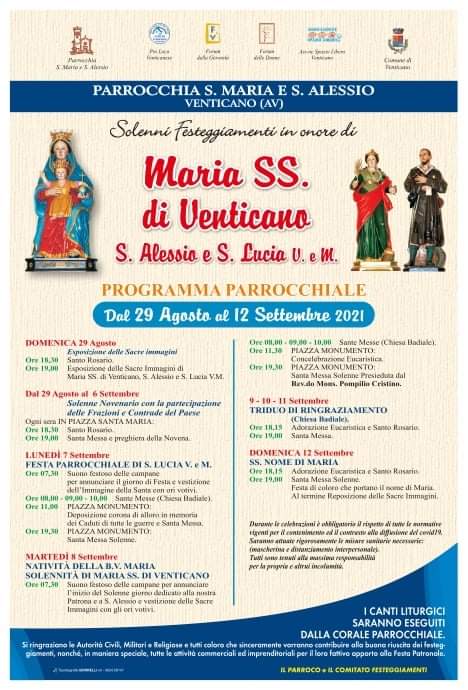 La parrocchia S. Maria e S. Alessio in Venticano ha organizzato, dal 29 agosto al 12 settembre 2021, i solenni festeggiamenti in onore di Maria SS., S. Alessio e S. Lucia. Per il programma vedi il manifesto…