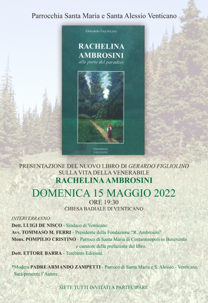 Domenica 15 maggio alle ore 19,30 nella chiesa badiale di Venticano presentazione del libro di Gerardo Figliolino sulla vita della venerabile Rachelina Ambrosini. Vedi la locandina…