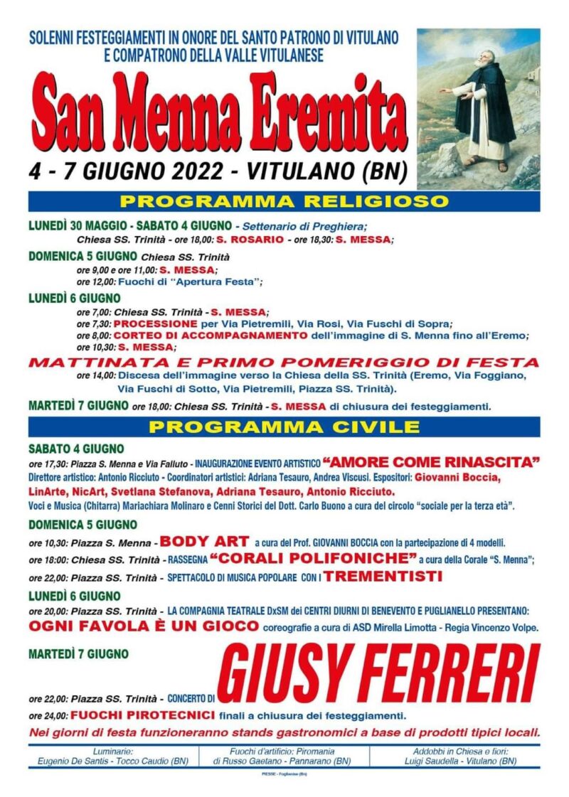 Vitulano festeggia San Menna eremita Solenni festeggiamenti, dal 4 al 7 giugno 2022, in onore del santo patrono di Vitulano e compatrono della Valle Vitulanese. Per il programma vedi il manifesto…