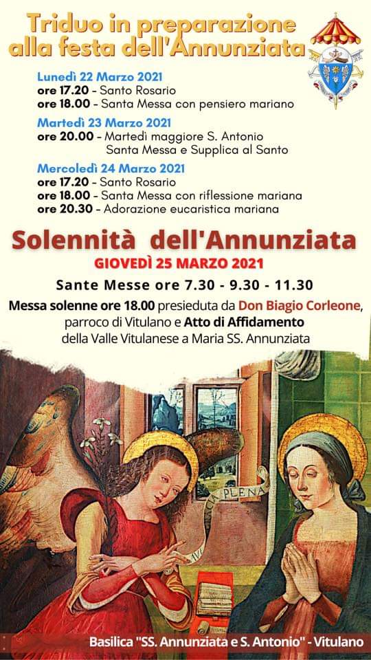 Vitulano, triduo in preparazione alla festa dell’Annunziata Nella basilica “SS. annunziata e S. Antonio” di Vitulano triduo di preparazione alla festa dell’Annunziata. Per il programma vedi il manifesto…