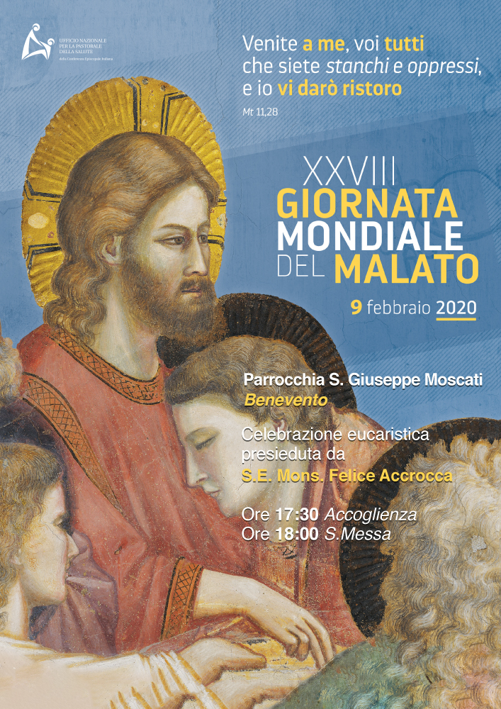 Domenica 9 febbraio alle ore 17,30 presso la parrocchia di S.Giuseppe Moscati in Benevento, si celebrerà, a livello diocesano, la XXVIII Giornata mondiale del malato dal titolo “Venite a me, voi tutti che siete stanchi e oppressi, e io vi darò ristoro” . La celebrazione eucaristica presieduta dall’arcivescovo mons. Felice Accrocca è in programma alle ore 18. Il Vangelo, invita tutti noi, ad andare a Lui, noi che portiamo dei macigni nel cuore, che non capiamo che cosa ci stia accadendo, che non abbiamo ancora saputo risolvere i grandi interrogativi della nostra vita. Andiamo a Lui, noi che siamo sconvolti dalle disgrazie, dalla malattia, dal dolore e dalla sofferenza, dopo averli strenuamente combattuti, dopo averne cercato in ogni modo il «perché» … perché proprio «adesso», perché proprio a me, perché proprio in questo modo.