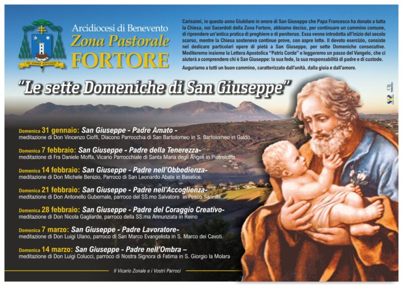 Zona Fortore: “Le sette Domeniche di San Giuseppe” In questo anno giubilare in onore di S. Giuseppe tutti i sacerdoti della zona Fortore hanno organizzato “Le sette Domeniche di San Giuseppe”. Per il programma vedi il manifesto…