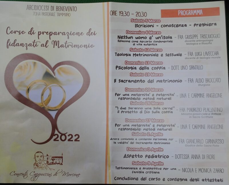 La zona Pastorale Tammaro, guidato dal vicario foraneo don Sergio Rossetti, propone presso il convento dei Cappuccini di Morcone una serie di incontri per fidanzati in preparazione alla celebrazione del sacramento del matrimonio, un cammino condiviso per conoscere Cristo e ri-conoscerlo nella vita matrimoniale. Il calendario degli incontri di quest’anno e tutte le informazioni utili sono sul manifesto…