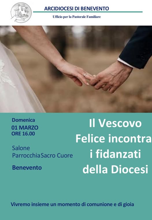 L’arcivescovo, mons. Felice Accrocca, incontra i fidanzati dell’ Arcidiocesi di Benevento domenica, 1° marzo 2026 alle 16.00, presso la Parrocchia del Sacro Cuore di Gesù a Benevento.