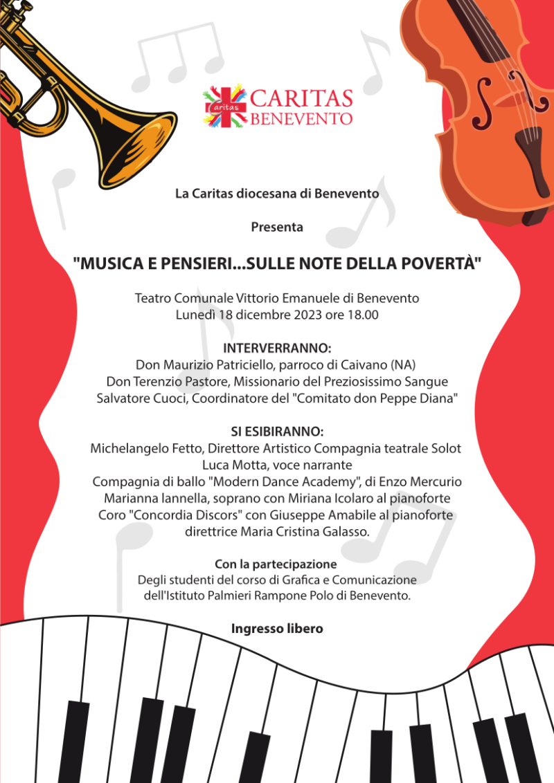 Il 18 dicembre 2023, alle ore 18, al teatro comunale di Benevento: “Musica e pensieri…sulle note della povertà”. La serata è organizzata dalla Caritas diocesana di Benevento, interverranno don Maurizio Patriciello, Parroco di Caivano (Na); don Terenzio Pastore, missionario del Preziosissimo Sangue e Salvatore Cuoci, coordinatore del “Comitato don Peppe Diana”. Spettacolo con l’esibizione di Michelangelo Fetto, direttore artistico Compagnia teatrale Solot; Luca Motta, voce narrante; la compagnia di ballo “Modern Dance Accademy”, di Enzo Mercurio; Marianna Iannella, con Miriam Icolaro al pianoforte; il coro “Concordia Discors” con Giuseppe Amabile al pianoforte e direttrice Cristina Galasso. Ci sarà la partecipazione degli studenti del corso di grafica e comunicazione dell’Istituto Palmieri rampone Polo di Benevento. Ingresso libero.