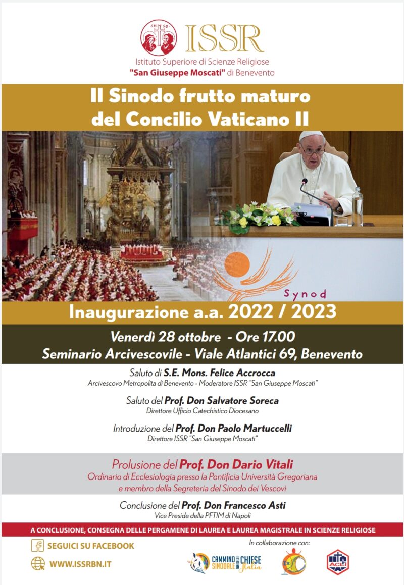 Si terrà venerdì 28 ottobre presso il Seminario Arcivescovile, a partire dalle ore 17.00, la cerimonia di inaugurazione dell’a.a. 2022-23 dell’Istituto Superiore di Scienze Religiose “san Giuseppe Moscati” con sede in Benevento. La prolusione sul tema “Il Sinodo, frutto maturo del Concilio Vaticano II” sarà tenuta dal Prof. Don Dario Vitali, Ordinario di ecclesiologia presso la Pontificia Università Gregoriana e membro della Segreteria del Sinodo dei Vescovi. Porteranno i saluti S.E. Mons. Felice Accrocca, Arcivescovo Metropolita di Benevento, Moderatore ISSR “San Giuseppe Moscati” ed il Prof. Don Salvatore Soreca, Direttore dell’Ufficio catechistico diocesano. Introdurrà i lavori il Prof. Don Paolo Martuccelli, Direttore ISSR “San Giuseppe Moscati”. Concluderà la cerimonia il Prof. Don Francesco Asti, Vice Preside della Pontificia Facoltà Teologica dell’Italia Meridionale di Napoli. Nel corso della inaugurazione si terrà anche la consegna delle pergamene di laurea e laurea magistrale a circa 60 laureati in Scienze Religiose.