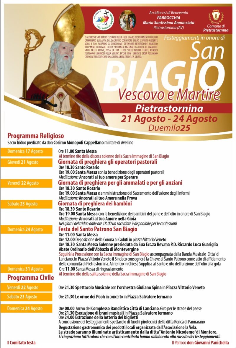 La parrocchia “Maria Santissima Annunziata” Pietrastornina (Av), guidata dal parroco don Giovanni Panichella,  ha organizzato i festeggiamenti religiosi per San Biagio vescovo e martire… Per il programma vedi manifesto…
