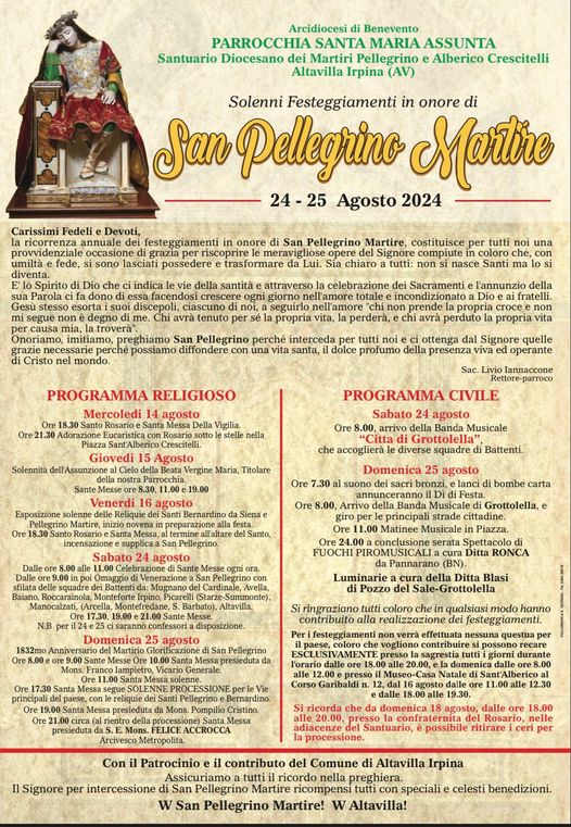 Altavilla Irpina in festa per San Pellegrino Altavilla Irpina si prepara a vivere i solenni festeggiamenti in onore di San Pellegrino Martire 24-25 agosto. Ecco il programma…