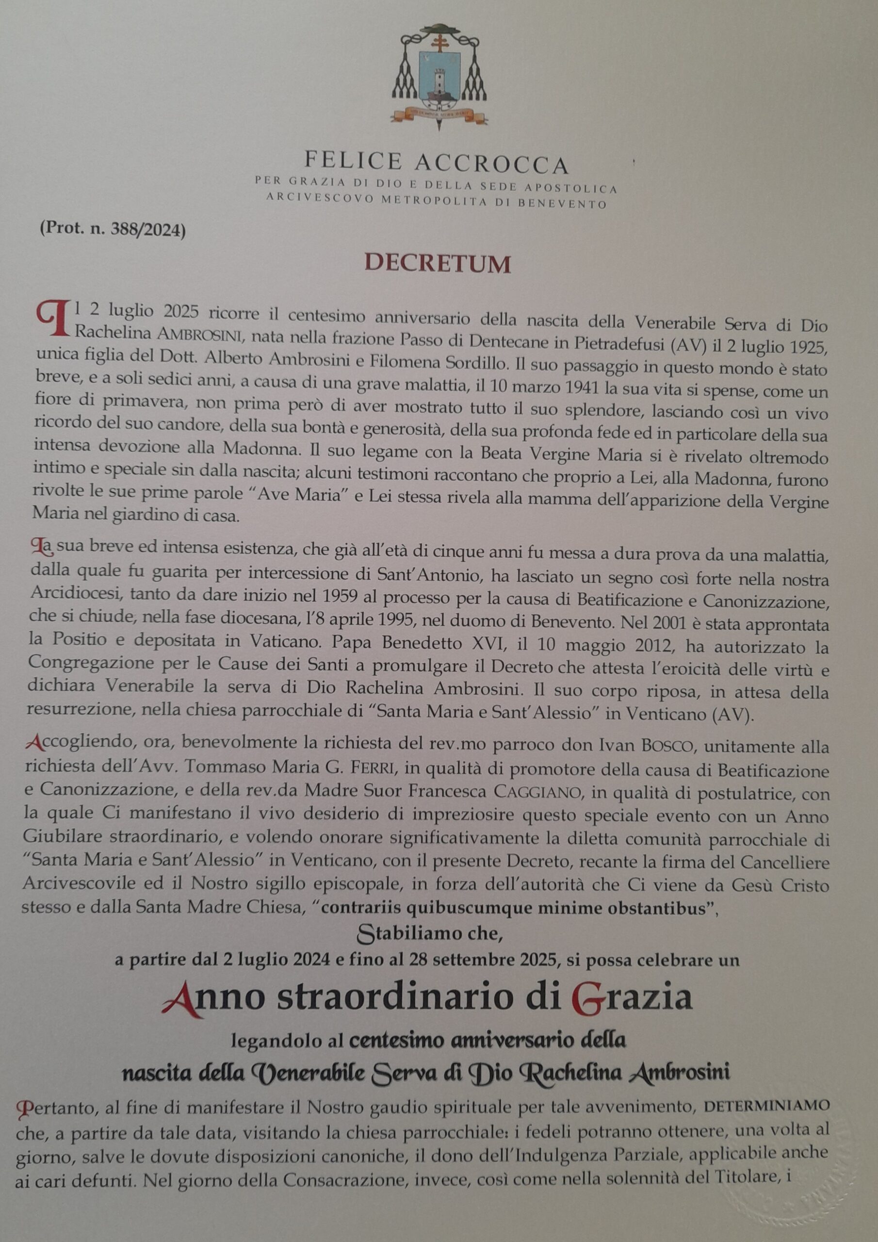 Monsignor Felice Accrocca, arcivescovo di Benevento, ha stabilito che a partire dal 2 luglio 2024, Solennità della Madonna delle Grazie nonché anniversario della nascita della Venerabile Serva di Dio Rachelina Ambrosini si possa celebrare un particolare Anno di Grazia. Uno storico avvenimento, ricorrendo il centenario della nascita, che consentirà a tutti coloro che visiteranno la chiesa parrocchiale e madre di Santa Maria e Sant’Alessio in Venticano di ottenere il dono dell’Indulgenza. Appuntamento il 2 luglio alle ore 19 per la Santa Messa.