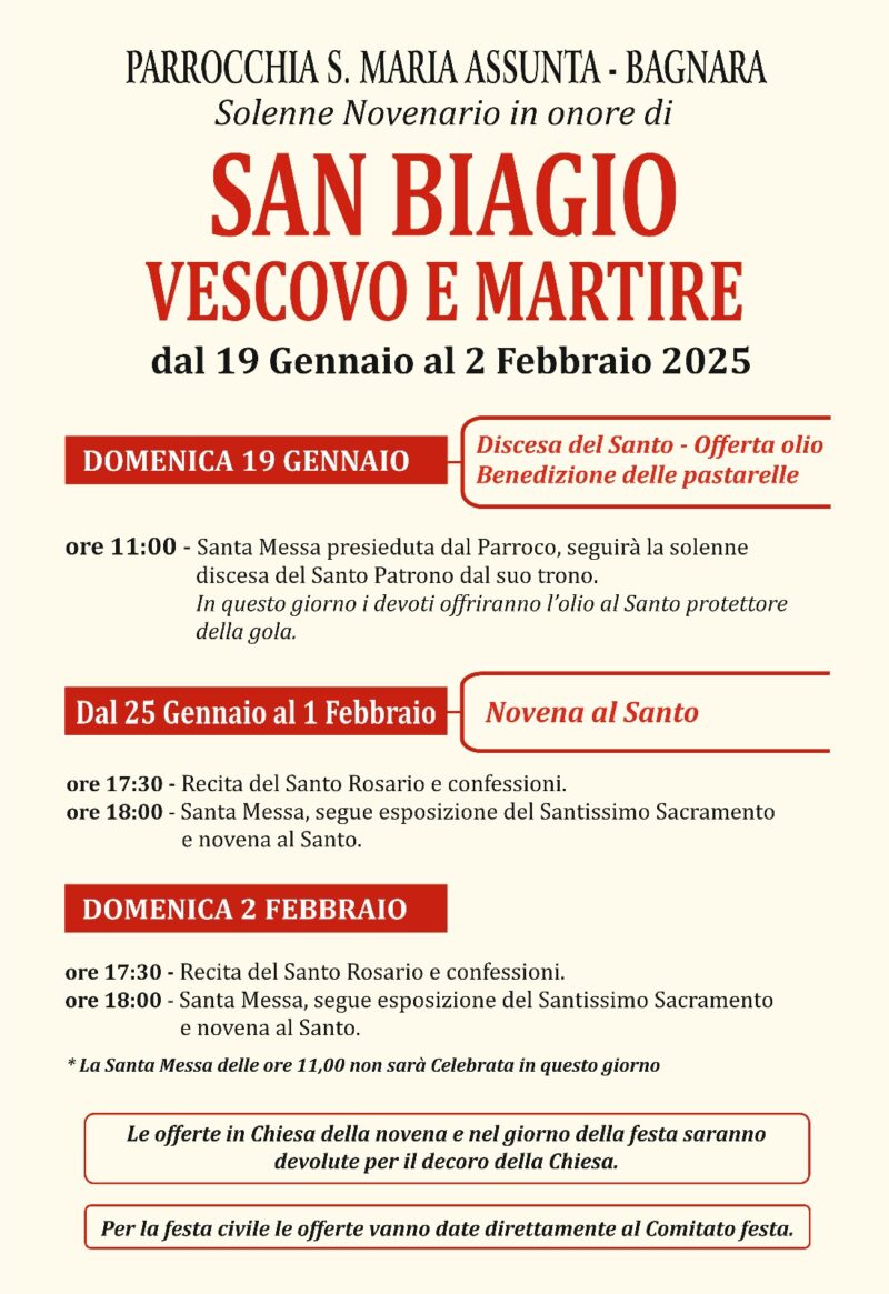 Bagnara: novenario in onore di San Biagio La parrocchia S. Maria Assunta di Bagnara, guidata dal parroco don Antonio Bonavita, si prepara a vivere il solenne novenario in onore di San Biagio vescovo e martire dal 25 gennaio al 1° febbraio 2025. Per il programma vedi il manifesto…