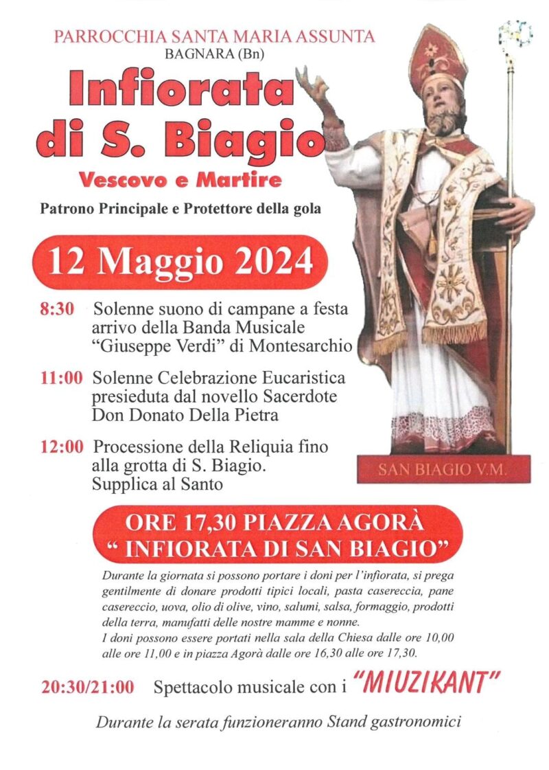 La parrocchia Santa Maria Assunta di Bagnara, guidata dal parroco don Antonio Bonavita, ha organizzato per domenica 12 maggio 2024 alle ore 17,30 l’infiorata di San Biagio in piazza agorà. La giornata inizia con l’esplosione dei mortai e arrivo della banda musicale; alle ore 11 solenne celebrazione eucaristica, presieduta dal novello sacerdote don Donato Della Pietra e alle ore 12 processione della reliquia del santo fino alla grotta di san Biagio e supplica.