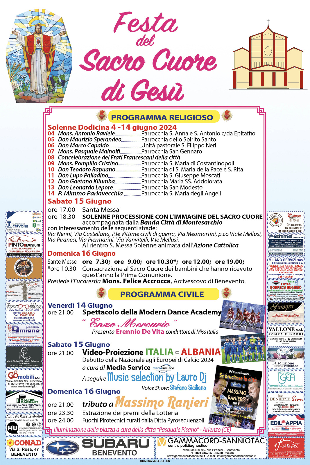 Il 15 Giugno alle ore 17 sarà celebrata la Santa Messa e alle 18.30 avrà inizio la solenne Processione con l’immagine del Sacro Cuore, accompagnata dalla banda Città di Montesarchio, il corteo religioso interesserà le seguenti strade: via Nenni, via Castellana, p.le Vittime civili di guerra, via Meomartini, parco viale Mellusi, via Piranesi, via Piermarini, via Vanvitelli, viale Mellusi. Al rientro si terrà la Messa solenne animata dall’Azione Cattolica.
