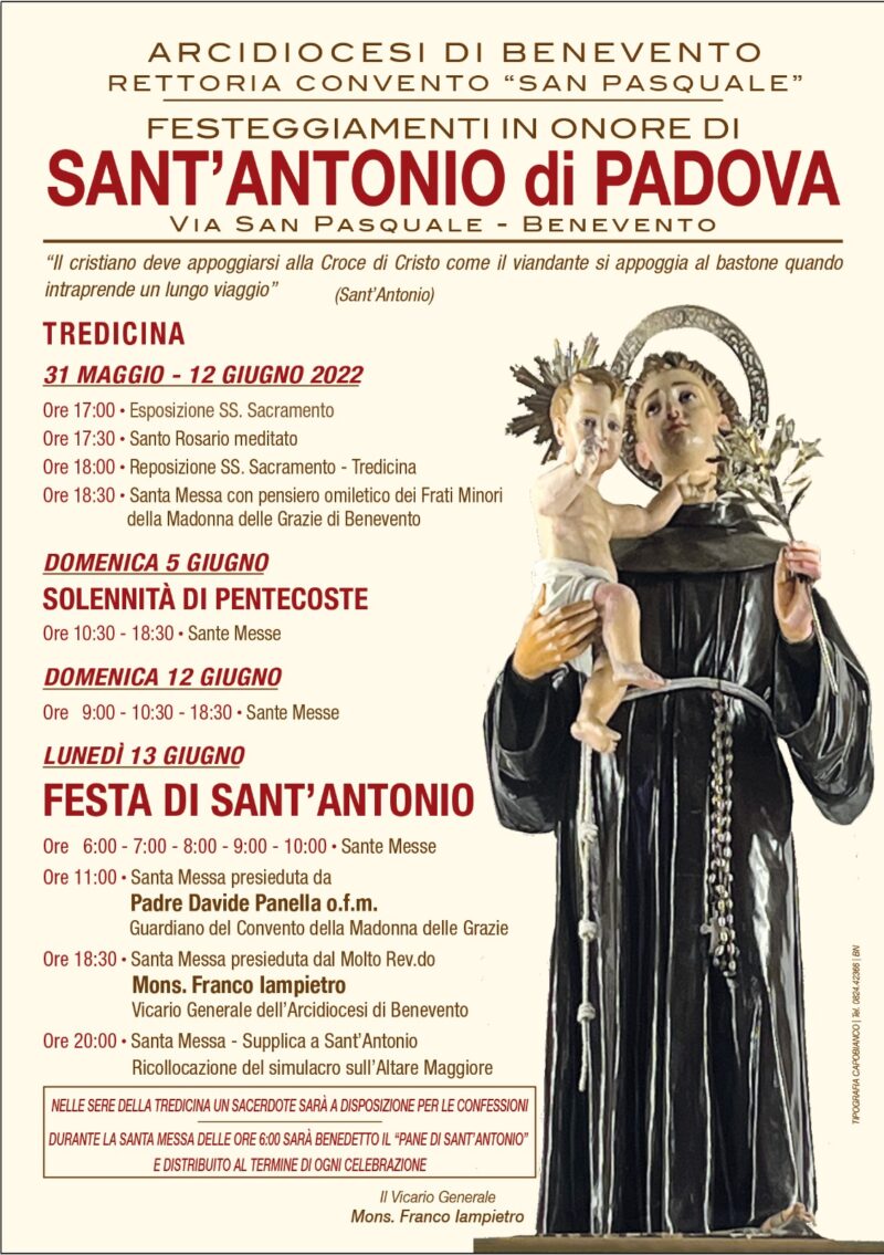 In città si festeggia Sant’Antonio da Padova nella chiesa conventuale di San Pasquale. Si parte con la tredicina al Santo fino al 12 giugno. Lunedì 13 giugno festa di S. Antonio in programma sette Messe alle ore 6, 7, 8, 9, 10, 11 e 18,30.