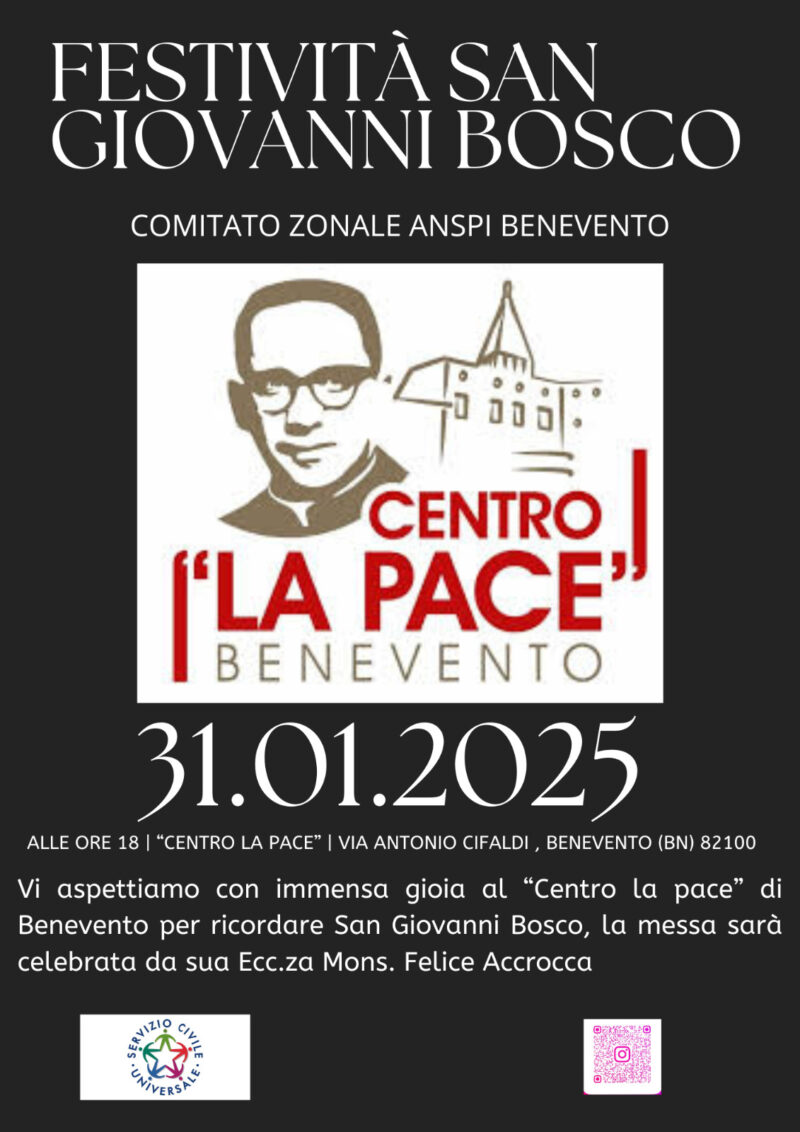 Il comitato zonale dell’Anspi (Associazione Nazionale San Paolo Italia) di Benevento, guidato dal presidente Rosario De Nigris ha organizzato per il giorno 31 gennaio 2025, alle ore 18, al Centro La Pace, una solenne celebrazione eucaristica, in occasione della festività di San Giovanni Bosco, fondatore della congregazione dei Salesiani, ideatore degli oratori e santo ispiratore dell’Anspi. La santa messa sarà presieduta dall’arcivescovo, mons. Felice Accrocca.