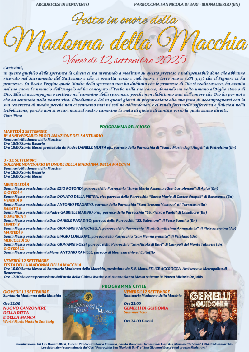 Al via le celebrazioni in vista della festa della protettrice di Buonalbergo, Maria Santissima della Macchia. Quasi tutte le celebrazioni si terranno al Santuario diocesano. Si inizia con il secondo anniversario della proclamazione a santuario diocesano; poi il novenario in preparazione alla festa del 12 settembre.