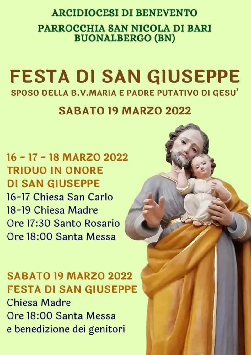 Buonalbergo: festa di S. Giuseppe Il Parroco di “San Nicola di Bari” di Buonalbergo, don Pino Mottola, ha reso noto il programma delle celebrazioni in vista della festa di San Giuseppe. Vedi il manifesto….