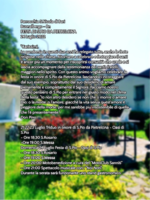 Buonalbergo: festa di San Pio da Pietrelcina La parrocchia S. Nicola di Bari di Buonalbergo festeggia il 24 luglio S. Pio da Pietrelcina. Per il programma vedi il manifesto…