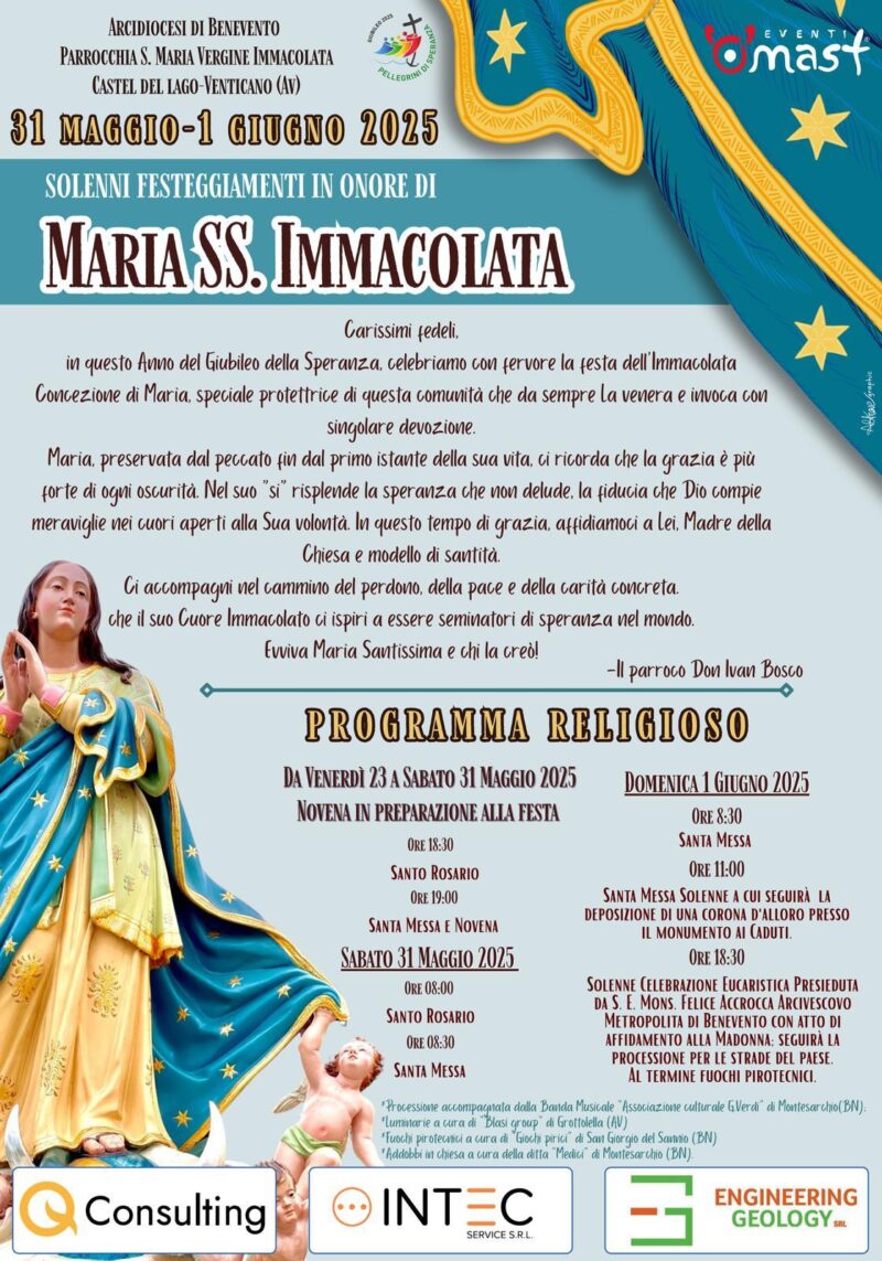 La comunità parrocchiale S. Maria Vergine Immacolata di Castel del Lago, frazione di Venticano (Av), guidata da don Ivan Bosco, nei giorni 31 maggio e 1° giugno festeggia Maria SS. Immacolata. Per il programma vedi il manifesto…
