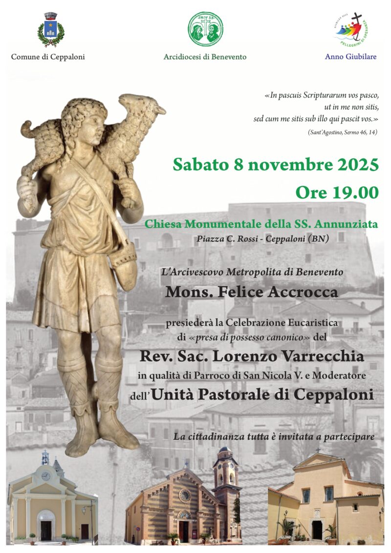 Sabato 8 novembre 2025, alle ore 19, presso la chiesa monumentale della SS. Annunziata di Ceppaloni l’arcivescovo metropolita di Benevento mons. Felice Accrocca presiederà la celebrazione eucaristica di “presa di possesso canonico” del rev. sacerdote Lorenzo Varrecchia, in qualità di parroco di San Nicola Vescovo e moderatore dell’Unità pastorale di Ceppaloni.