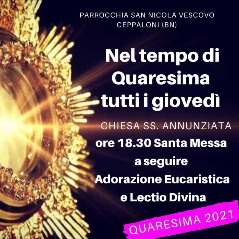 Nella parrocchia S. Nicola Vescovo di Ceppaloni, nel tempo di quaresima, tutti i giovedì, nella chiesa della SS. Annunziata alle ore 18,30 santa Messa a seguire Adorazione eucaristica e Lectio divina.