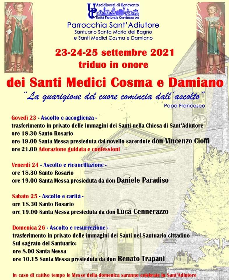 Cervinara triduo per i Santi Medici Cervinara festeggia i Santi Cosma e Damiano. Per il programma vedi il manifesto…