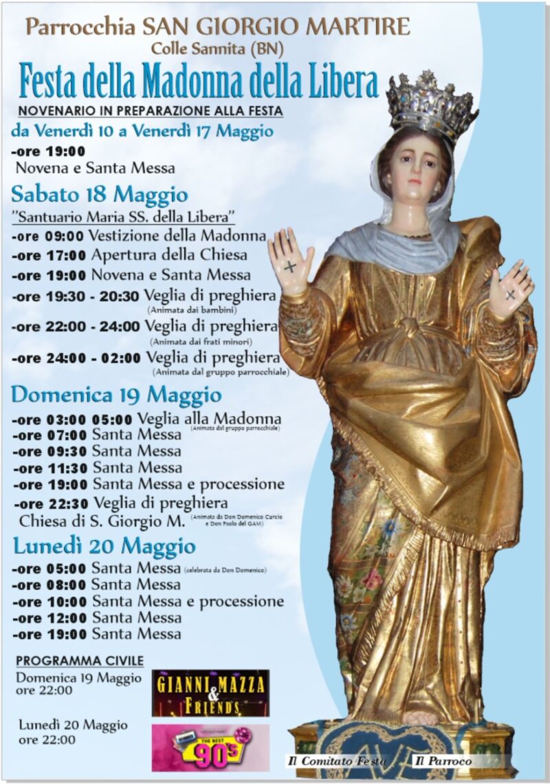 Colle Sannita festeggia la Madonna della Libera La parrocchia di San Giorgio Martire in Colle Sannita festeggia la Madonna della Libera, nel santuario diocesano, nei giorni 18, 19 e 20 maggio 2024.