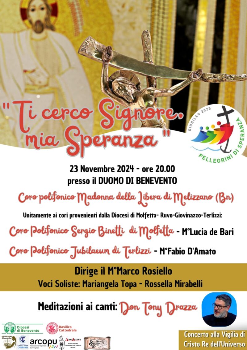 Il prossimo 23 novembre si terrà il tradizionale concerto alla vigilia di Cristo Re dell’Universo, giunto ormai alla terza edizione per il Coro Polifonico “Madonna della Libera” di Melizzano diretto dal M° Marco Rosiello. Quest’anno l’evento di meditazione e di canto sarà svolto nello splendido Duomo di Benevento e avrà come titolo “Ti cerco, Signore, mia Speranza” per richiamare la tematica scelta in occasione dell’anno giubilare che chiamerà tutta la comunità cristiana a riflettere sul grande dono della Speranza. In linea con le scorse edizioni, anche quest’anno il coro è lieto di poter prestare la voce alla preghiera e alla meditazione, si tratterà infatti di un momento non solo musicale ma anche di lode a Dio. Se la prima edizione si è arricchita della presenza del responsabile di musica sacra della Conferenza Episcopale Calabra, don Domenico Lando, e della storica voce solista del coro della Diocesi di Roma, Paola Cecchi; la seconda edizione ha contato sulla presenza del liturgista, compositore e direttore, don Fabio Massimillo, e sulla voce solista di Mariangela Topa, la terza edizione non può essere da meno.