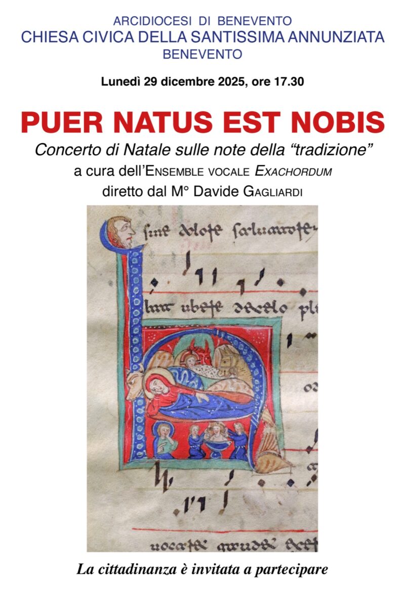 Presso la chiesa civica della Santissima Annunziata di Benevento, lunedì 29 dicembre prossimo, con inizio alle ore 17. 30, l’Ensemble Vocale Exachordum, diretta dal Maestro Davide Gagliardi, terrà il Concerto di Natale “Puer natus est nobis”. Il titolo è tratto dall’introito della Messa di Natale, divenuto uno dei brani più noti del repertorio gregoriano, che è riconosciuto dalla Chiesa cattolica come “canto proprio della liturgia romana“. È cantato in lingua latina, rigorosamente “a cappella” per non alterarne l’armonizzazione, ed è il simbolo dell’antica tradizione monodica natalizia. Il concerto vedrà, inoltre, l’esecuzione di celebri brani di Giovanni Battista Pergolesi, esponente di spicco dell’epoca barocca, considerato uno dei maggiori musicisti italiani della prima metà del XVIII secolo.Le note della “tradizione” saranno affidate, tra le altre, alla composizione di Sant’Alfonso Maria de’ Liguori, “Tu scendi dalle stelle” (1754), il canto natalizio più celebre, e “Astro del ciel” (autore Joseph Mohr), che esprime il desiderio universale di illuminazione spirituale e serenità.